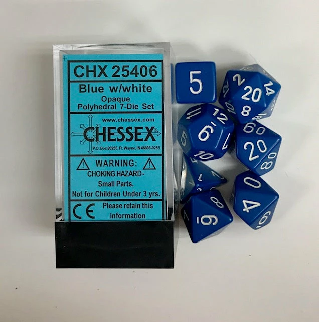 This Chessex dice set is simple and easy to read blue with white numbering. Great for people beginning a die collection or just looking for a new dice set to increase their rolling options.