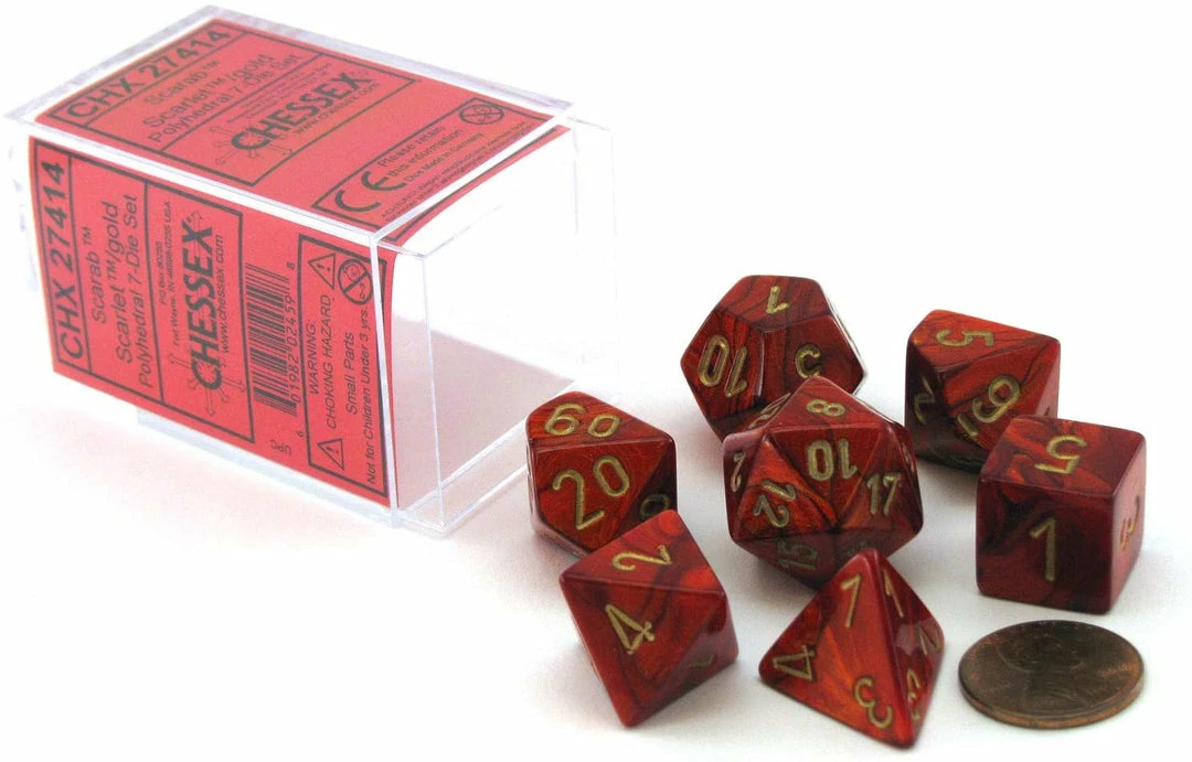 This Chessex dice set is simple and easy to read scarab scarlet with gold numbering. Great for people beginning a die collection or just looking for a new dice set to increase their rolling options.