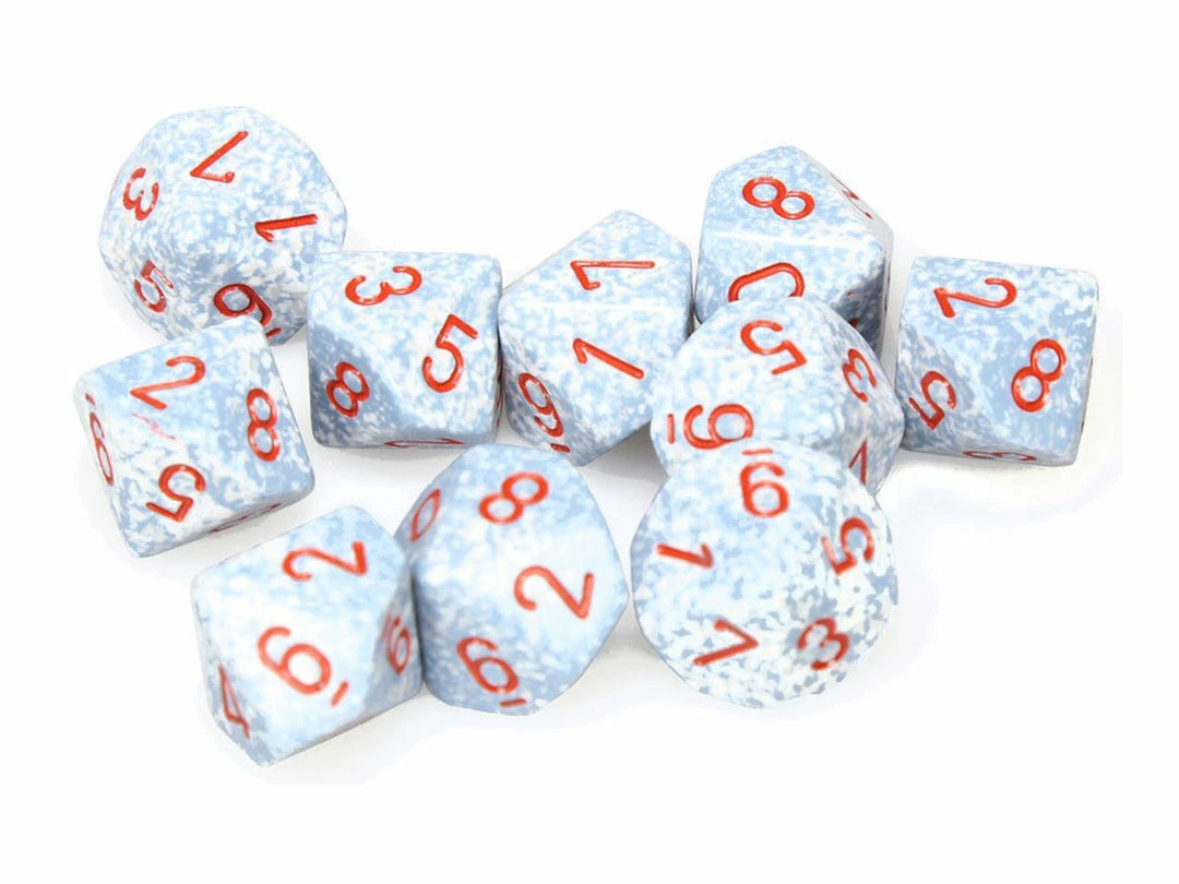 Set of 10d10 speckled Air dice with red numbering. This set of ten-sided dice is ideal for any World of Darkness game, from Vampire, Werewolf and Mage to Changeling and Aberrant. This dice set is standard-sized 16mm dice.