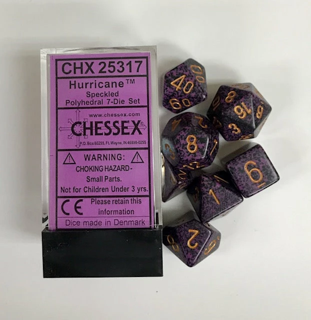 This Chessex dice set is simple and easy to read Hurricane with gold numbering. Great for people beginning a die collection or just looking for a new dice set to increase their rolling options.
