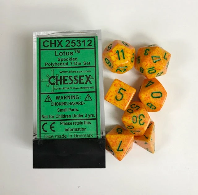 This Chessex dice set is simple and easy to read Lotus with green numbering. Great for people beginning a die collection or just looking for a new dice set to increase their rolling options.