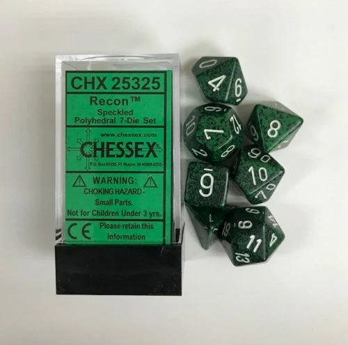 This Chessex dice set is simple and easy to read Recon with white numbering. Great for people beginning a die collection or just looking for a new dice set to increase their rolling options.
