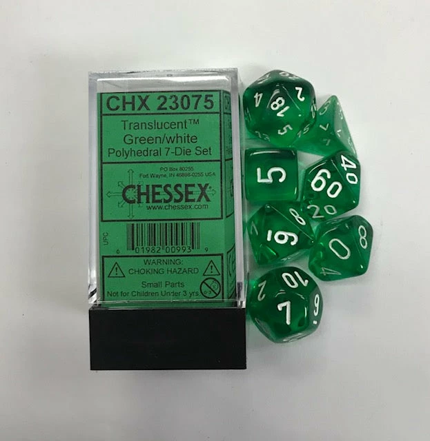 This Chessex dice set is simple and easy to read green with white numbering. Great for people beginning a die collection or just looking for a new dice set to increase their rolling options.