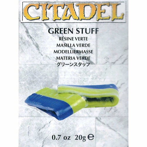 Green Stuff is a two-part modelling putty that is useful for filling in gaps on models and sculpting additional details. When the two colours are mixed together, they form a malleable putty that can be applied to plastic, resin and metal miniatures and then moulded into shape using a Citadel Sculpting Tool. Once it has fully cured, Green Stuff is solid enough to glue other components to and can be painted over using Citadel Paints.