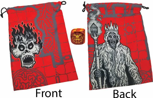 What should you do if you have too many dice? (Well, thats silly, because you can NEVER have too many dice!) But what you COULD do is pick up this dicebag! This striking (and roomy) fantasy-themed dice bag will help you keep all those treasures right at your fingertips. The drawstring bag is made of blue fabric, lined with black satin, and holds more than 100 assorted dice! This lich-adorned 6in x 9in bag will be a valuable addition to your next game day, no matter where you play!