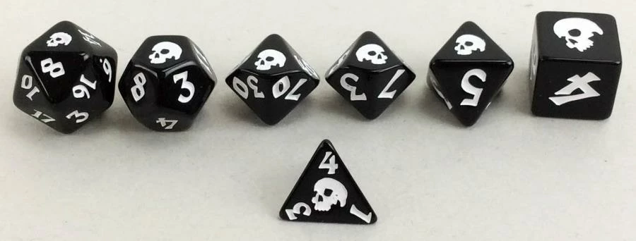 The Black Death has arrived! This 7 dice polyhedral set (standard RPG set) are sized up to match our 19mm d6s, so they are a handful of death! These come in two variations: The Great Black Death and the Pink Dice of Death. Each of the dice features a deathly skull design on the max face (other than the d4) to go with the theme. Be sure to check out the matching Black Death dice bag!