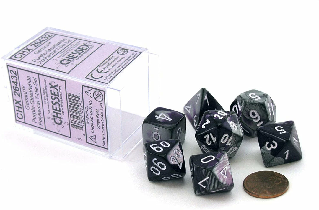 This Chessex dice set is simple and easy to read purple-steel mix with white numbering. Great for people beginning a die collection or just looking for a new dice set to increase their rolling options.