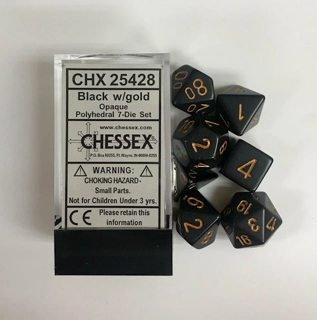This Chessex dice set is simple and easy to read black with gold numbering. Great for people beginning a die collection or just looking for a new dice set to increase their rolling options.