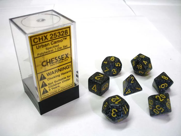 This Chessex dice set is simple and easy to read Urban Camo with yellow numbering. Great for people beginning a die collection or just looking for a new dice set to increase their rolling options.