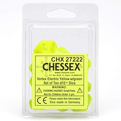 Set of 10d10 vortex electric yellow dice with green numbering. This set of ten-sided dice is ideal for any World of Darkness game, from Vampire, Werewolf and Mage to Changeling and Aberrant. This dice set is standard-sized 16mm dice.