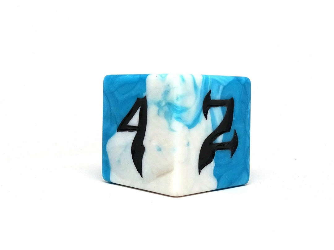 This enormous 48mm plastic dice is truly giant. This variety is our Cloud Giant D6. The color scheme has a blend of white and blues with black numbering.