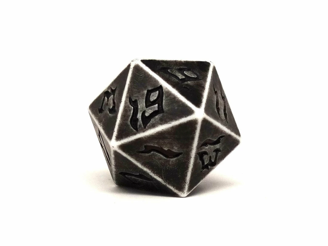 This enormous 48mm plastic dice is truly giant. This variety is our Stone Giant D20. The color scheme has a blend of black and grey with black numbering.