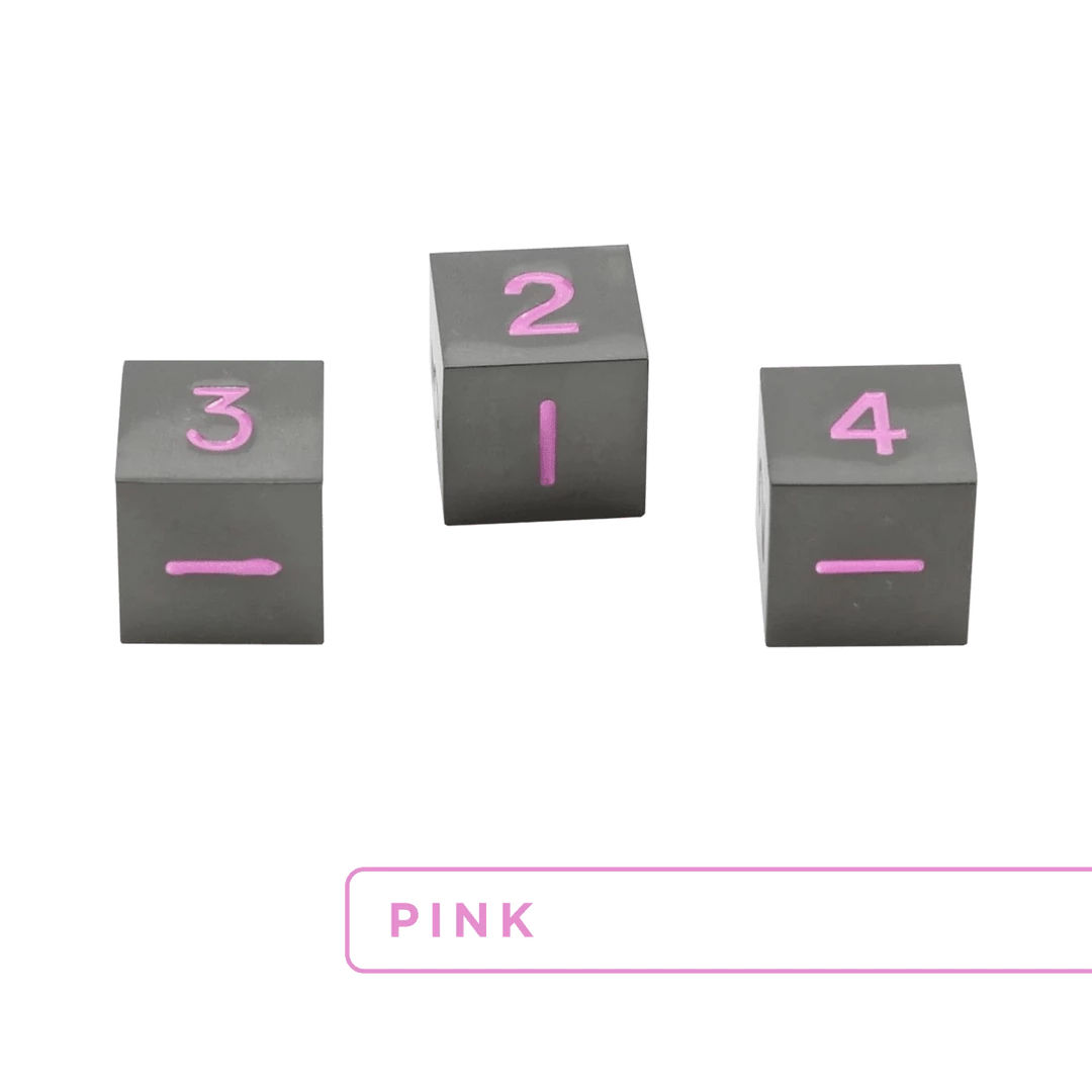 The dice are cast molded with a zinc alloy and then hand plated in black nickel. These are sturdy dice and hold up well to use. The numbers are colored with a specially selected color for each dice in our Gun Metal Dice Series. These have not been created like this before and we’re proud to bring these out.