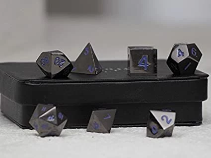 “What is the Gunmetal Dice Series? This is our special series created by us here at Easy Roller Dice Co. The dice are made of a special polished nickel and plated for a beautiful Metallic shimmer. This gives the dice a very gun-metalish look which is where the name for this series comes from. These metal polyhedral dice sets will have you gaming in beastly style.