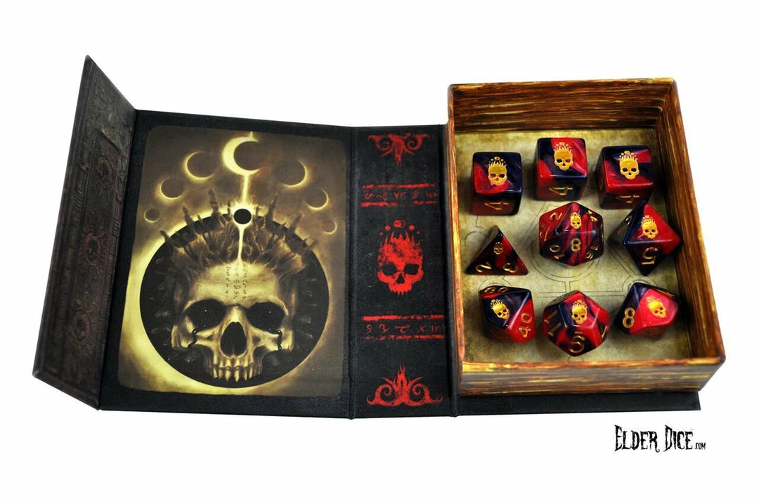Each set of Elder Dice contains the complete set of nine polyhedral gaming dice: 1 four-sided die, 3 six-sided dice, 1 eight-sided die, 1 ten-sided die, 1 ten-sided percentile die, 1 twelve-sided die, and 1 twenty-sided die.