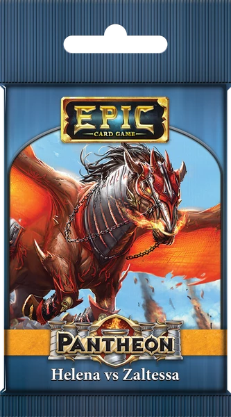 Epic Card Game: Pantheon is an expansion for the Epic Card Game that’s packaged in six non-random booster packs (Furios vs Maligus, Helena vs Zaltessa, Angeline vs Scara, Gareth vs Lashnok, Shadya vs Valentia, and Riksis vs Tarken), with each booster pack containing twelve new game cards, 2 deity/token cards, and 1 double sided token card.