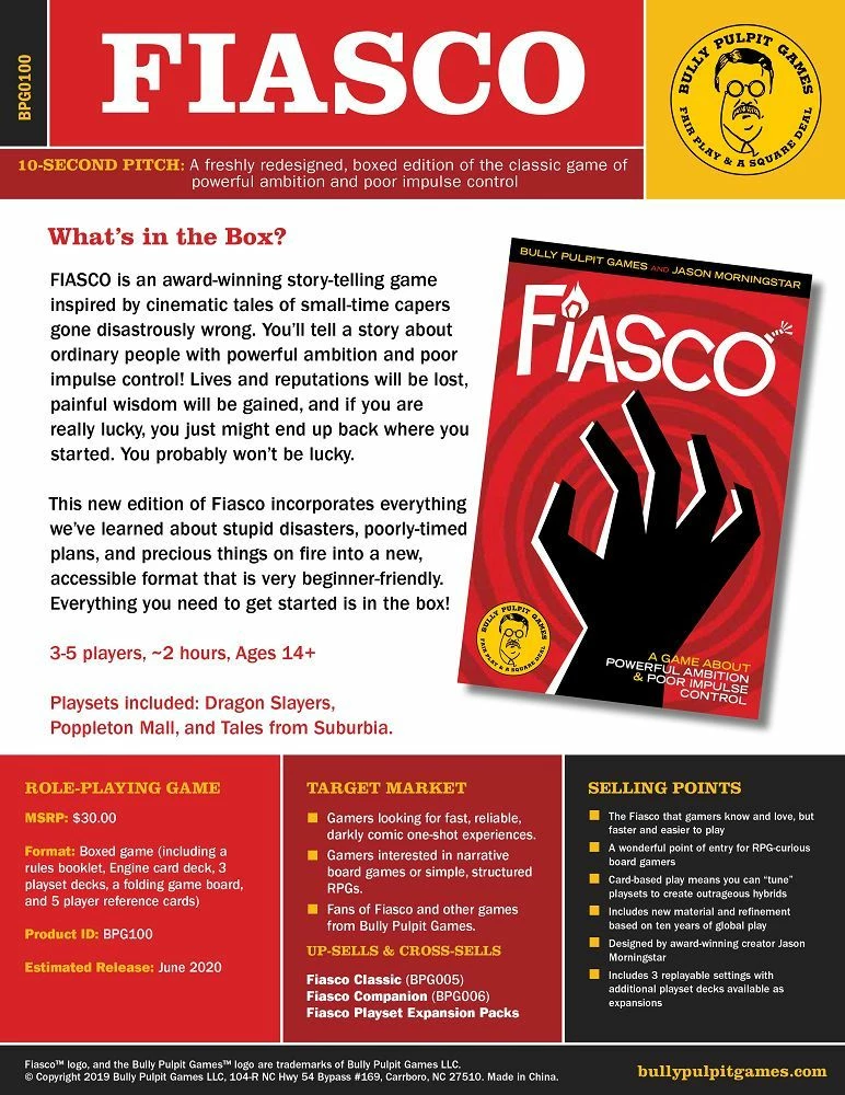 FIASCO is an award-winning story-telling game inspired by cinematic tales of small-time capers gone disastrously wrong. Youll tell a story about ordinary people with powerful ambition and poor impulse control! Lives and reputations will be lost, painful wisdom will be gained, and if you are really lucky, you just might end up back where you started. You probably wont be lucky. This new edition of Fiasco features an accessible gameformat that is very beginner friendly.Everything you need to get started is inside the box. 3-5 players, Ages 14+, Game Time 2 hours. Playsets included: Dragon Slayers, Poppleton Mall, and Tales from Suburbia.