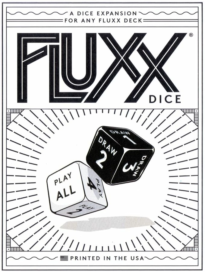 Fluxx Dice is an expansion that can be used with any Fluxx card game. The components are two dice — one showing “Draw 1”, “Draw 2”, etc. while the other shows “Play 1”, “Play 2”, “Play All”, etc. — and five cards. Instead of following the basic Fluxx rules, each turn players roll the draw and play dice, then follow the new rules set by their roll!