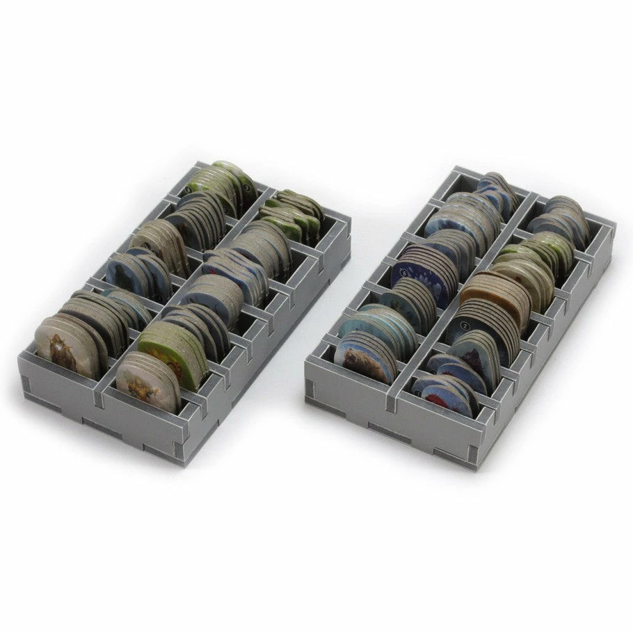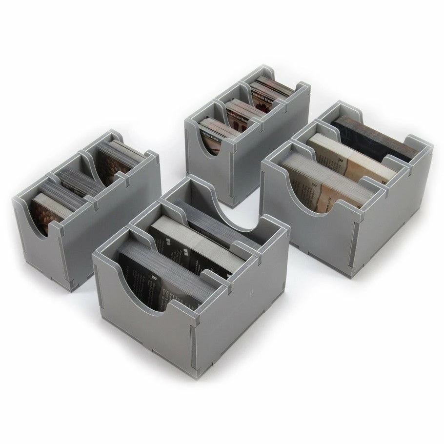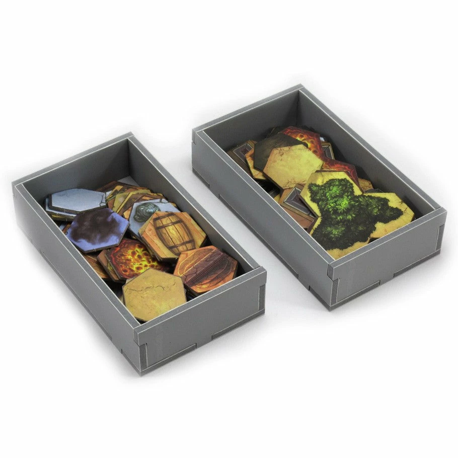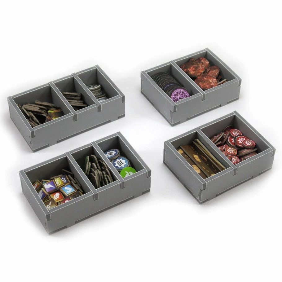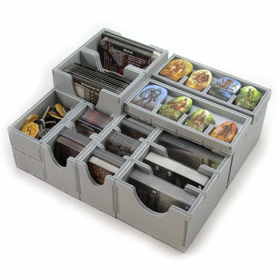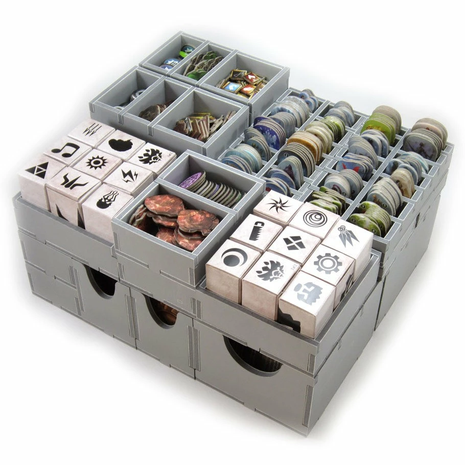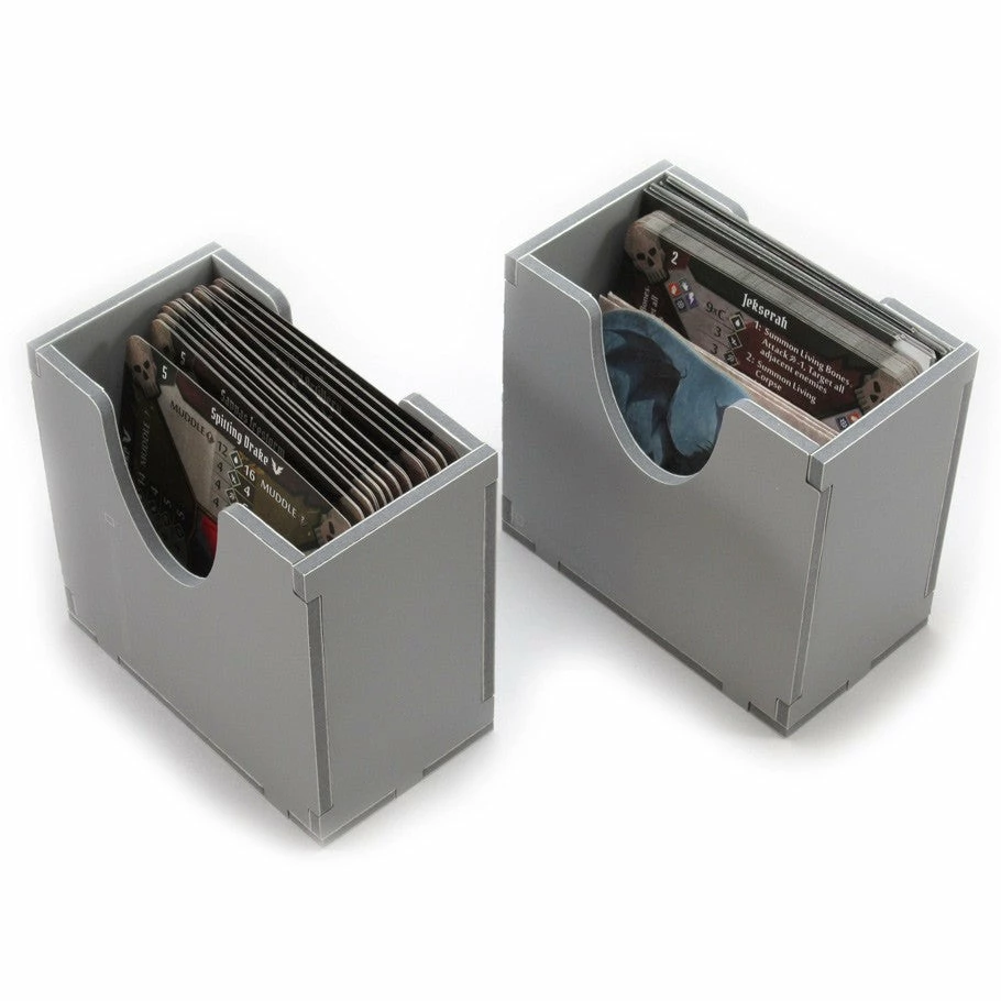 This insert is designed to be compatible with Gloomhaven®. The design provides both efficient storage and improved game play. Many of the trays can be utilised during the game, and they greatly aid set-up and clear-away times. There is space for all cards to be sleeved.