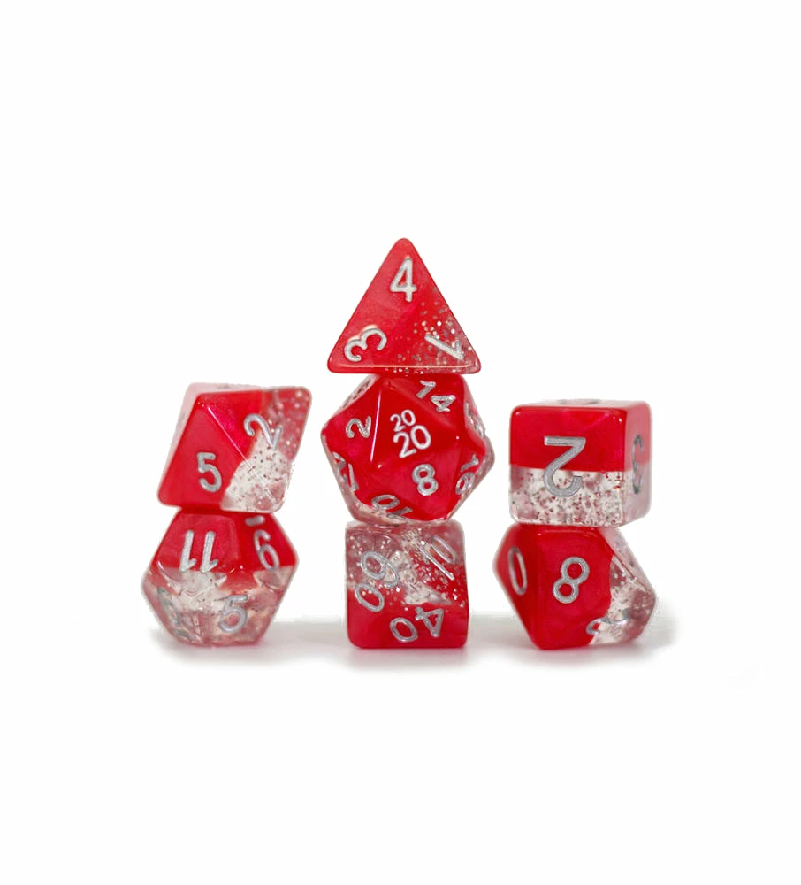…are the original layered dice! Featuring a unique half-&-half color arrangement, a semi-translucent nature, a pearlescent swirl within each color, and a smooth blend where the two colors meet.