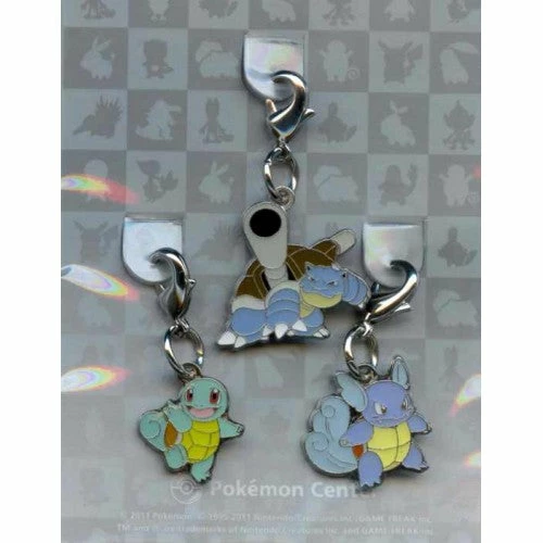 Pokemon Center 2011 Blastoise, Squirtle & Wartortle set of 3 charms. Only sold at the Japan Pokemon Centers in December, 2011 for a very limited time and in very limited quantity. They have clips so that they can clip on to bags, keyrings, bracelets or any other item that you wish to attach it to.