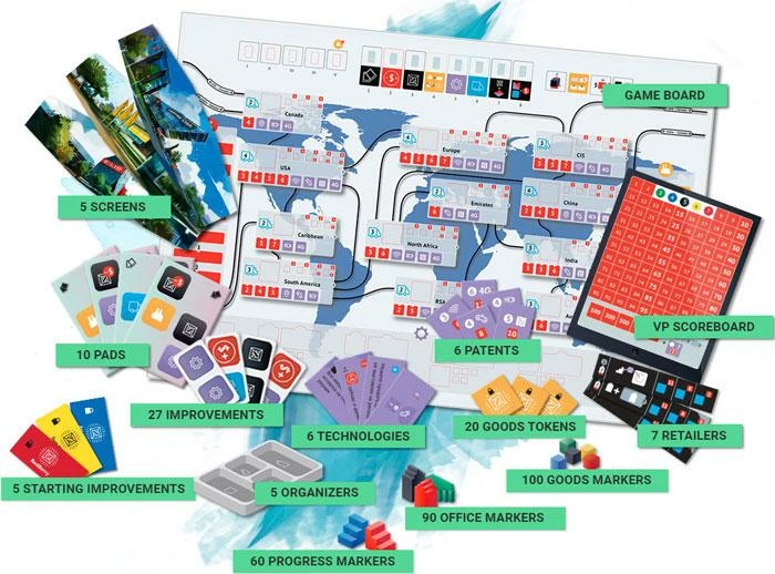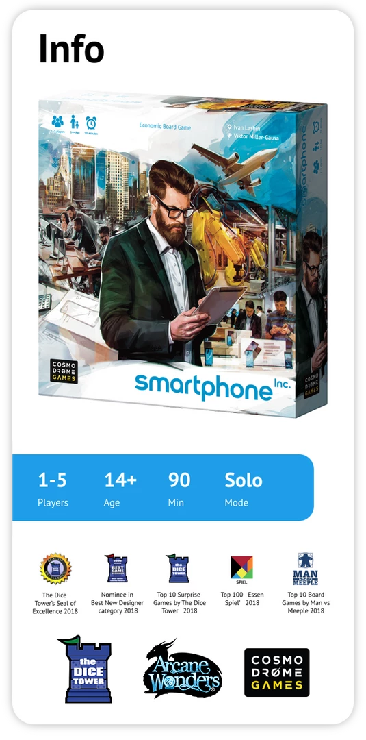 Smartphone Inc. is an economic simulation Eurogame. Over five rounds, players program their decisions about price, production, research, and expansion in order to earn more profits and become the most successful company in the world by earning more money than rivals. The game features a unique mechanism of planning, which combines patching mechanisms with bidding and action selection. Each of the rounds consists of eight simple phases: planning, pricing, production, development, research, expansion, selling, and profits.