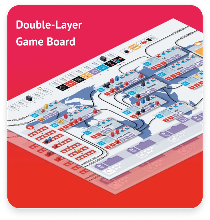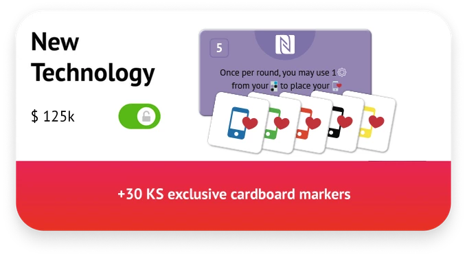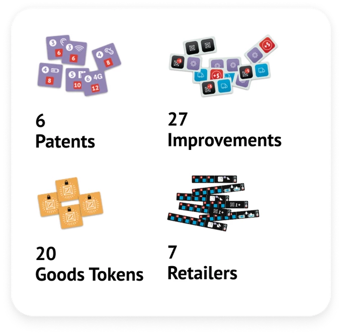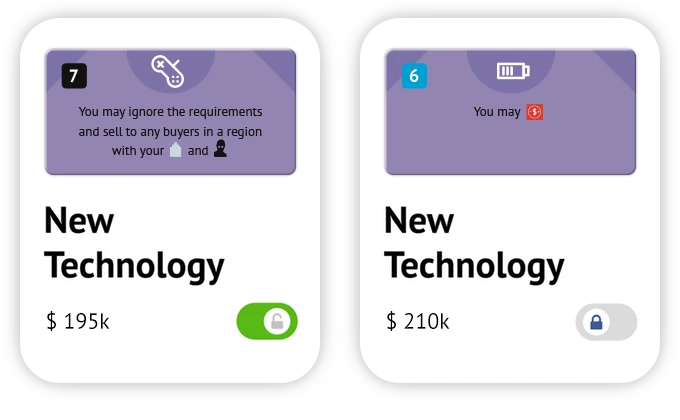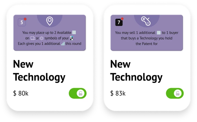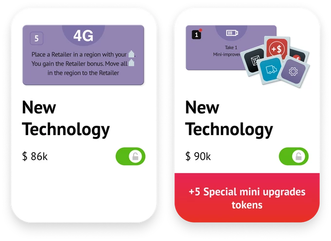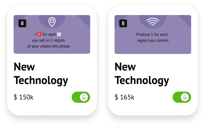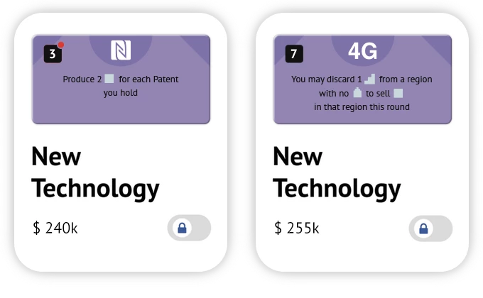 In research, players in turn order use their research points based on their decision to discover new technologies. Each technology has not only expanded players’ ability to sell smartphones to the customers, but also give them special power. There are 6 different technologies in the game, with every one of them has two different powers to use.