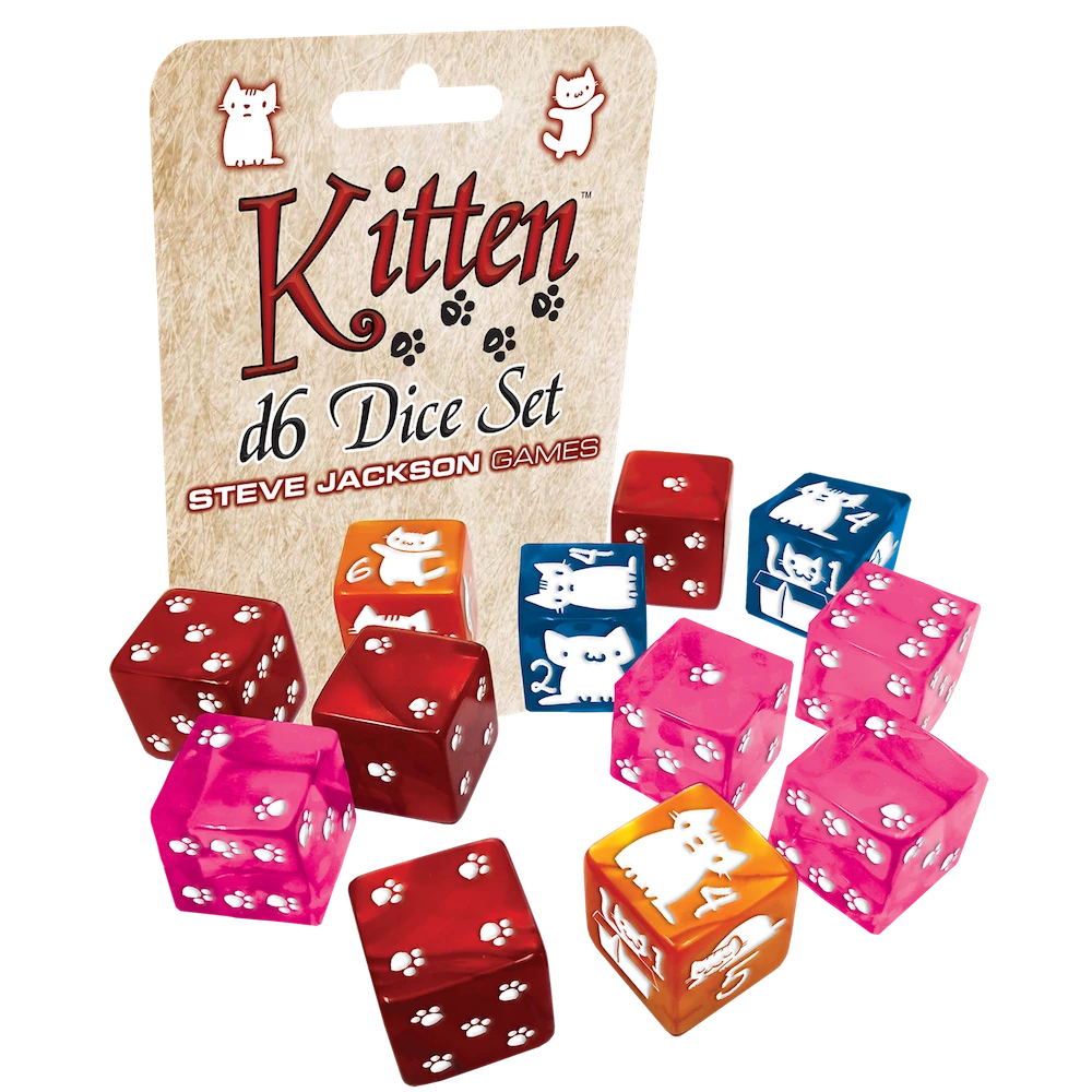 Featuring the adorable artwork of Katie Cook, this set of twelve 16mm six-sided dice brings mischievous kittens to your favorite game! They’ll appeal to gamer people and kitty people and everyone in between! Everyone needs more dice. Just be careful when you take these cute kitty and paw print dice to your next gaming session; the other cat fanatics at the table may try to knock the dice to the floor and keep them for their own dice collection.