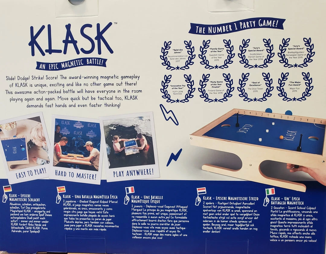 Each time you get a point, you must move your coin one point forward in the point slot. The player who first reaches the KLASK field wins.