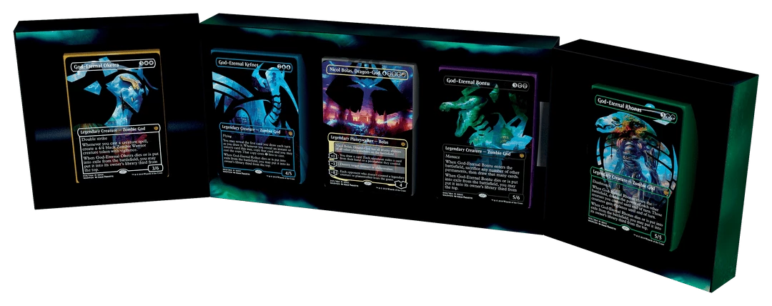 This box set centers around Nicol Bolas, the mighty Elder Dragon planeswalker, as he commences his final scheme to achieve ultimate godhood. Flanking him are the God-Eternals, an assembly of beings who were worshiped as gods on the Egyptian-inspired world of Amonkhet, where Bolas built an army with which to invade the city plane of Ravnica with the God-Eternals as his generals.