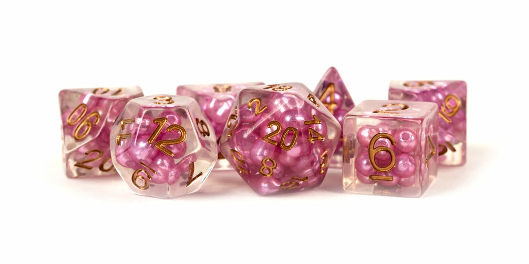 This set is infused with pearls! It’s hard to beat the value in our resin dice sets. Beautiful and affordable, these are great “Critical Reinforcers” to our metal dice. Each 16mm polyhedral set comes with 7 dice (d4, d6, d8, d10, d10 (00-90), d12, and d20).