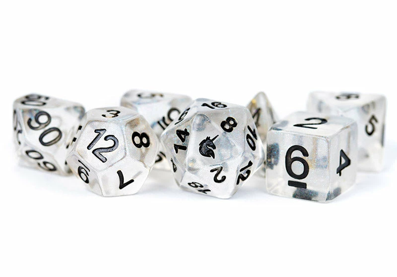 Unicorn dice are a beautiful mix of transparent resins, which are then infused with prismatic glitter dust that changes from blues to purples to greens as it hits the light. Each 16mm polyhedral set comes with 7 dice (d4, d6, d8, d10, d10 (00-90), d12, and d20).