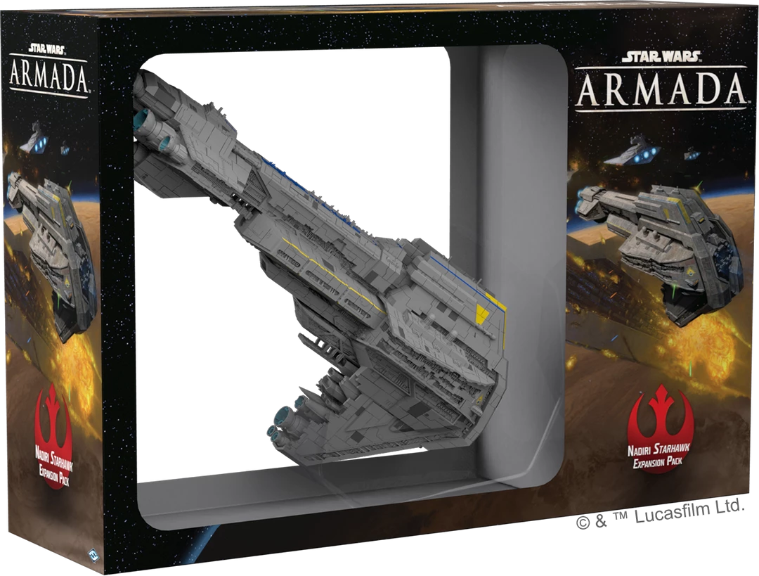 The Nadiri Starhawk Expansion Pack for Star Wars: Armada provides your rebels with everything they need to add 1 Starhawk-class Battleship to your game, including 1 painted ship, 1speed dial, 4 command dials, 2 ship cards, 15 upgrade cards, and a collection of assorted tokens.