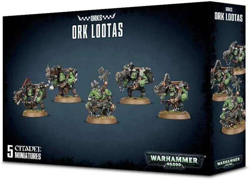 This multipart plastic boxed set contains enough components to make 5 models: either 4 Burna Boyz or 4 Lootas, as well as an Ork Mek armed with a kustom mega-blasta.