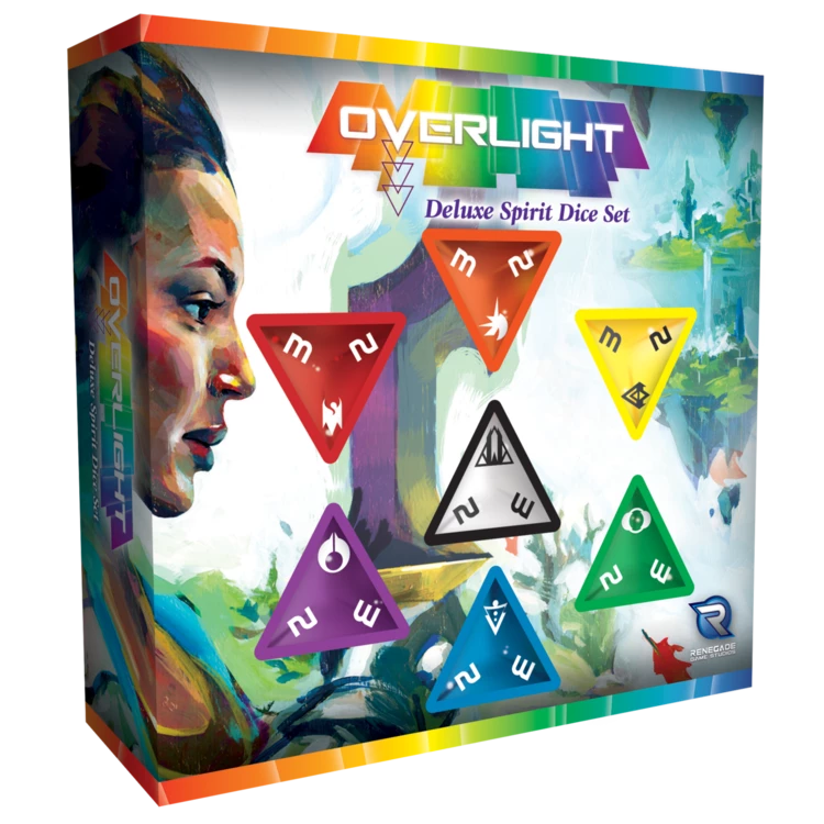 Herein you will find seven deluxe, over-sized Spirit Dice for Overlight — The Roleplaying Game of Kaleidoscopic Journeys. Like seven crystals mined from the mountains of Zenith, they are crafted in the colors of the Overlight and feature the sigils of the seven Virtues — Spirit, Wisdom, Logic, Compassion, Will, Vigor, and Might.