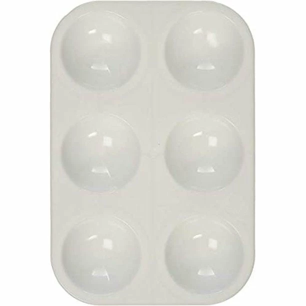 This economical, white plastic tray, with 6 circular wells for mixing paint, is durable and easy to clean. It measures 3-5/8“ × 5-1/4“.