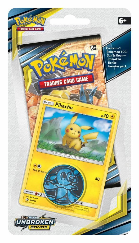 Each blister comes with 1 SM—Unbroken Bonds booster packs, a coin, and a promotional card of Pikachu.