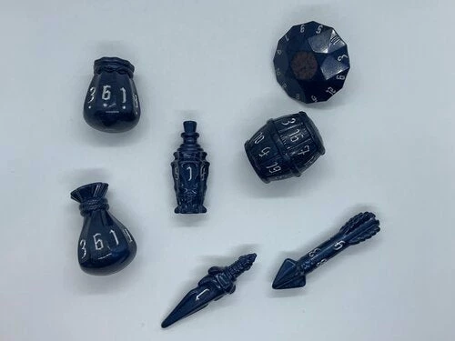 The Rogue Set is a classic RPG 7-piece dice set, themed for a Rogue! It contains a d20 powder keg, d12 gem, d10/d100 loot bags, d8 crossbow bolt, d6 poison vial, and d4 dagger.”