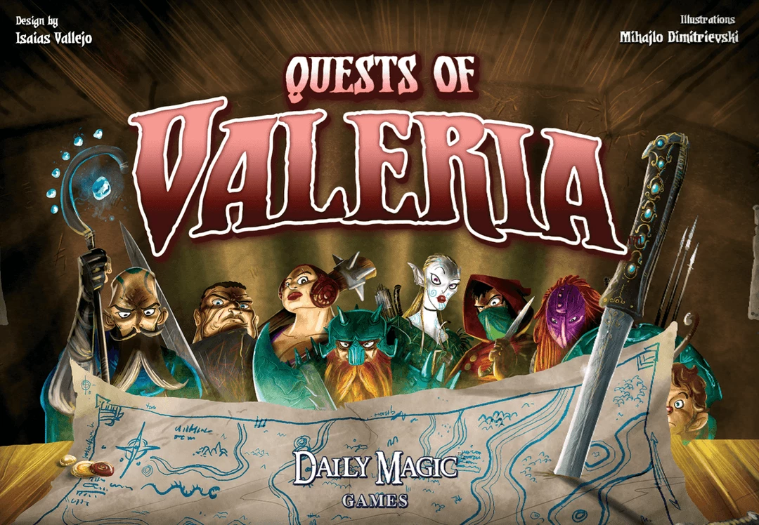 In Quests of Valeria you play the role of a Guild Master, recruiting and dispatching Citizens to complete quests posted in a tavern in the Capital City of Valeria to earn Victory Points. The player with the most Victory Points at the end of the game wins.