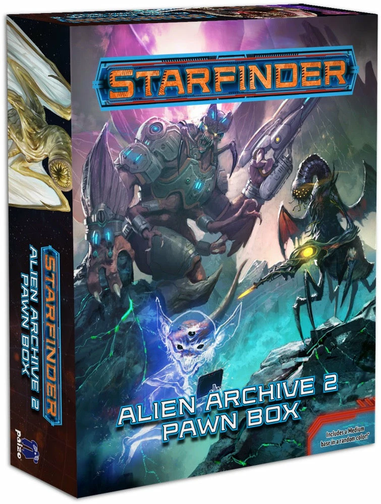 The interstellar perils of Starfinder Alien Archive 2 come alive on your tabletop with this box-busting collection of more than 300 creature pawns for use with the Starfinder Roleplaying Game or any tabletop science fantasy RPG! Printed on sturdy cardstock, each pawn features a beautiful full-color image of an alien from the Starfinder RPG’s second collection of interplanetary threats and unique player character races. Each cardboard pawn slots into a size-appropriate plastic base, making it easy to mix with traditional metal or plastic miniatures. With multiple pawns for commonly encountered creatures and a handful of new foes to fight in starship combat, the Starfinder Alien Archive 2 Pawn Box is the best way to ensure you’ve got the perfect characters to bring your Starfinder campaign to life!