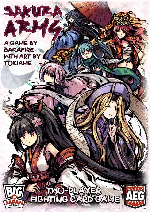 Sakura Arms — known in Japanese as 桜降る代に決闘を — is a two-player dueling game in which players first choose two of seven megami (Japanese goddesses), each of which has a different keyword that empowers some of their cards. Players then see what the opponent chose before assembling a deck of ten out of 22 cards, with the players choosing cards both to take advantage of their own megami powers and to exploit their opponent’s weaknesses. Players then duel to see who will be victorious.