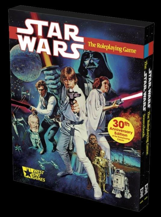 Our Star Wars™: The Roleplaying Game 30th Anniversary Edition is a faithful, limited edition recreation of both Star Wars: The Roleplaying Game and The Star Wars™ Sourcebook, both printed with higher quality than the originals and packaged in a stylized slipcase.