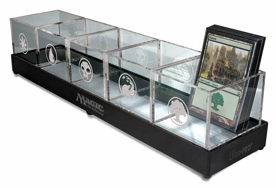 Magic: The Gathering Acrylic Land Caddy has 5 acrylic trays with engraved Mana symbols, set in a black acrylic base. Each tray holds 100+ cards sleeved or unsleeved.