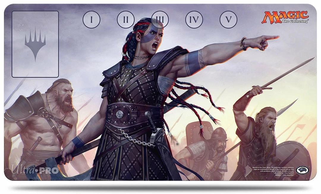 Deck out your next Magic Commander gaming session with this official Magic: The Gathering “Saskia the Unyielding” playmat. Part of the 2016 Magic Commander release, this playmat is made with premium fabric top to prevent damage to cards during game play. This playmat features both a Command Zone and a place to keep track of just how much damage your Commander has done to each opponent. With dimensions of approximately 24″ X 13-1/2″, this playmat is also the perfect decorative over sized mouse pad for computer and laptop workstations. Non-slip rubber backing lets the playmat lay flat and prevents it from shifting during use.