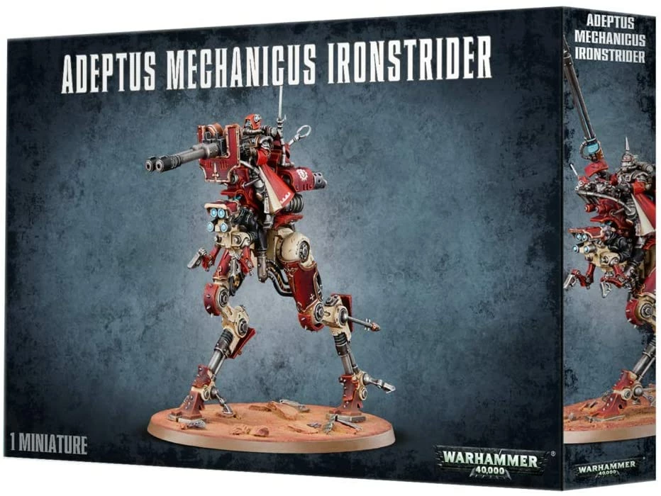 As a mobile artillery weapons platform, the Ironstrider Ballistarius can be fitted with one of two armament options: a twin-linked cognis autocannon or a twin-linked cognis lascannon. The split-toed legs can be posed in two different configurations, with suspensors that can be modelled at differing angles, and the entire surface of the machine crawls with sensors, data collection modules and antennae. The gunner has four head options; three hooded and one rebreather.