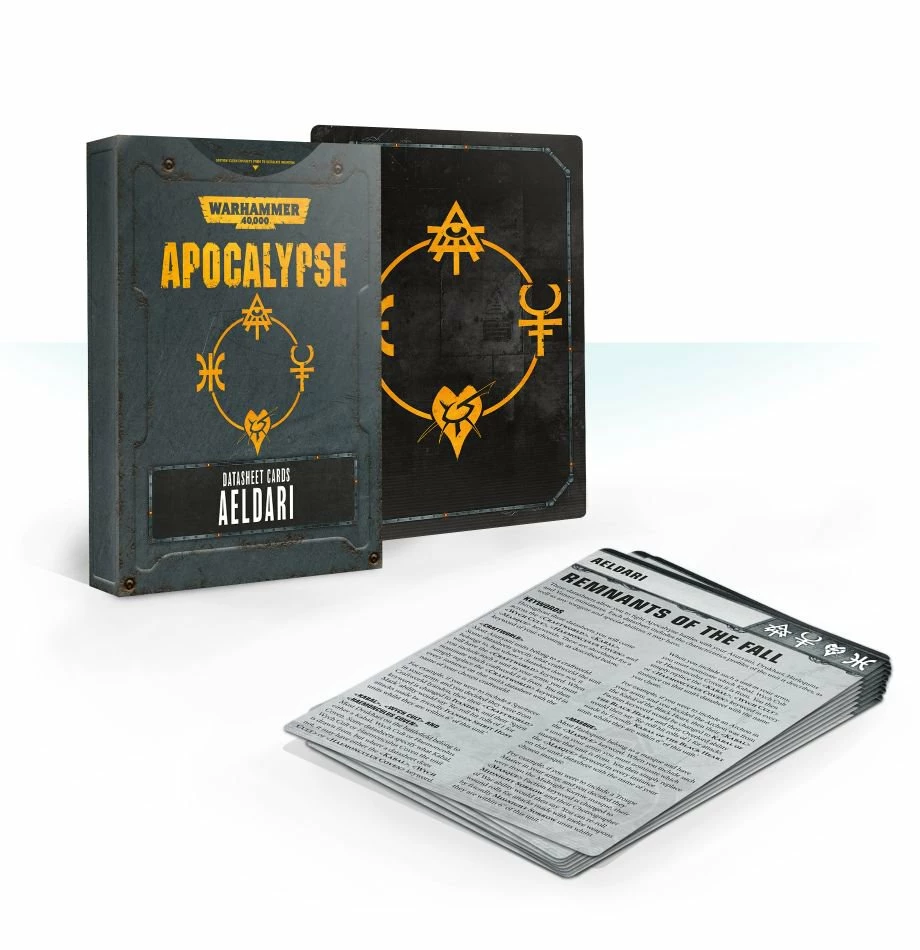 A set of Datasheets specifically designed for using your Aeldari Citadel miniatures in games of Warhammer 40,000: Apocalypse. Each datacard provides the full rules and profiles for a single unit from the Aeldari factions. Also included is a Faction card that details the various faction rules that apply to Asuryani, Drukhari, Ynnari and Harlequins Detachments. The reverse side of each card features the faction’s icon.