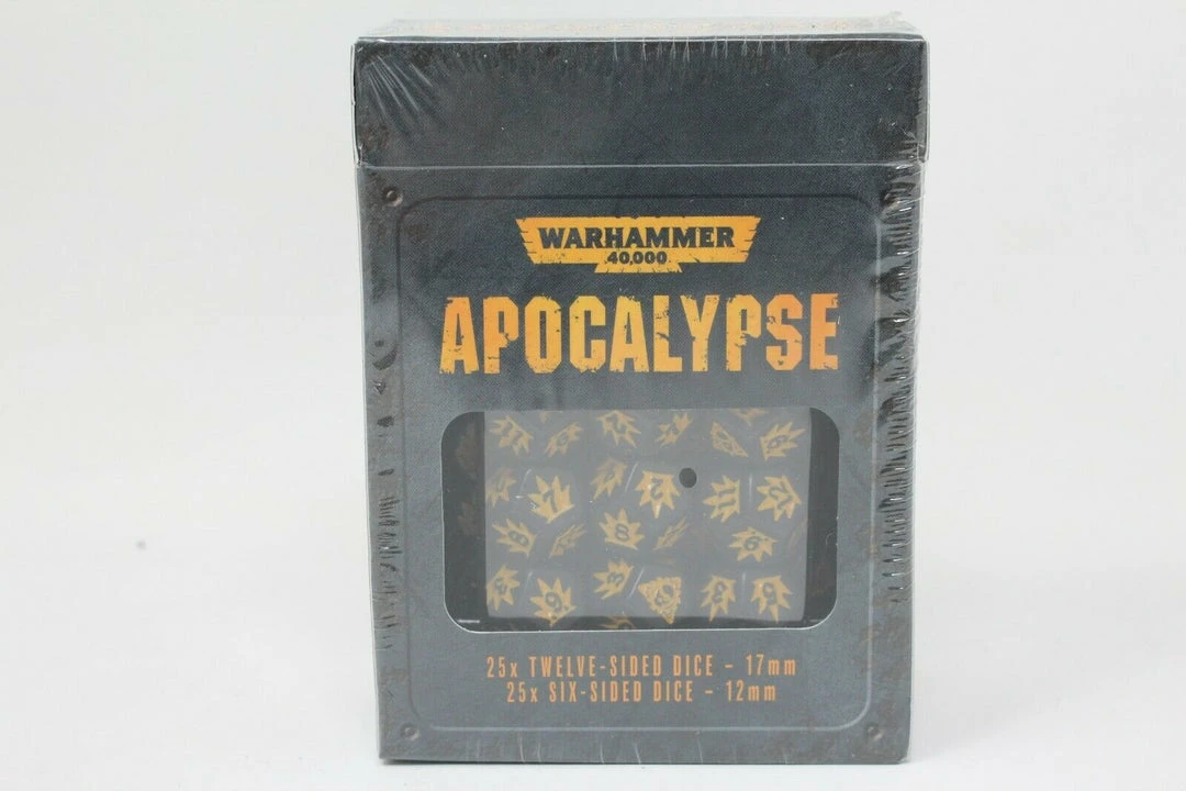 A set of 50 dice designed for use with Warhammer 40,000: Apocalypse, comprising 25 six-sided dice (D6s) and 25 twelve-sided dice (D12s). Each die is black in colour with orange details, and features Apocalypse skull design in place of 1. All other faces display a number set within an explosion.