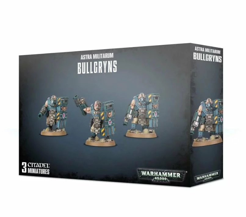 The abhumans known as Bullgryns are a formidable sight to behold. Clad in custom-made carapace armour made from the discarded tracks of a Leman Russ, they carry crude assault weaponry that capitalises on their stature and resilience.