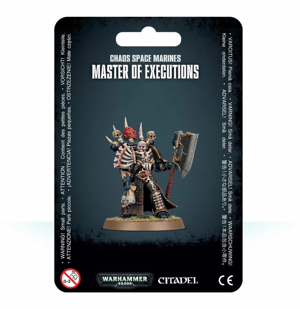 The Master of Executions is multipart plastic kit. He is a striking HQ choice in a Chaos Space Marines army whose sole purpose is to eliminate enemy characters with his fearsome (and utterly enormous) axe of dismemberment. The model displays all the grisly hallmarks of an executioner, with a trophy rack, bone decoration all over his armour, and he also clutches a pair of recently decapitated heads in his right hand.