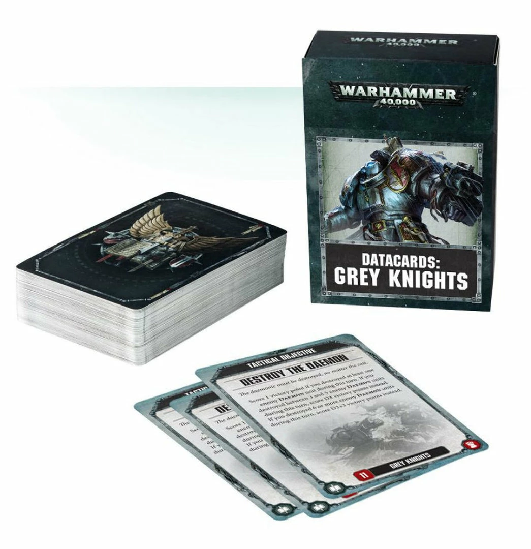 Designed to make it easier to keep track of Tactical Objectives, psychic powers and Stratagems in games of Warhammer 40,000, this set of 62 cards – each featuring artwork on the reverse – is an indispensable tool in the arsenal of any Grey Knights gamer. Included: